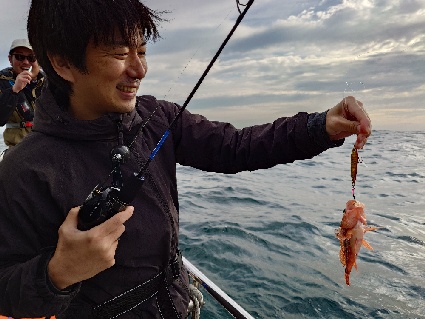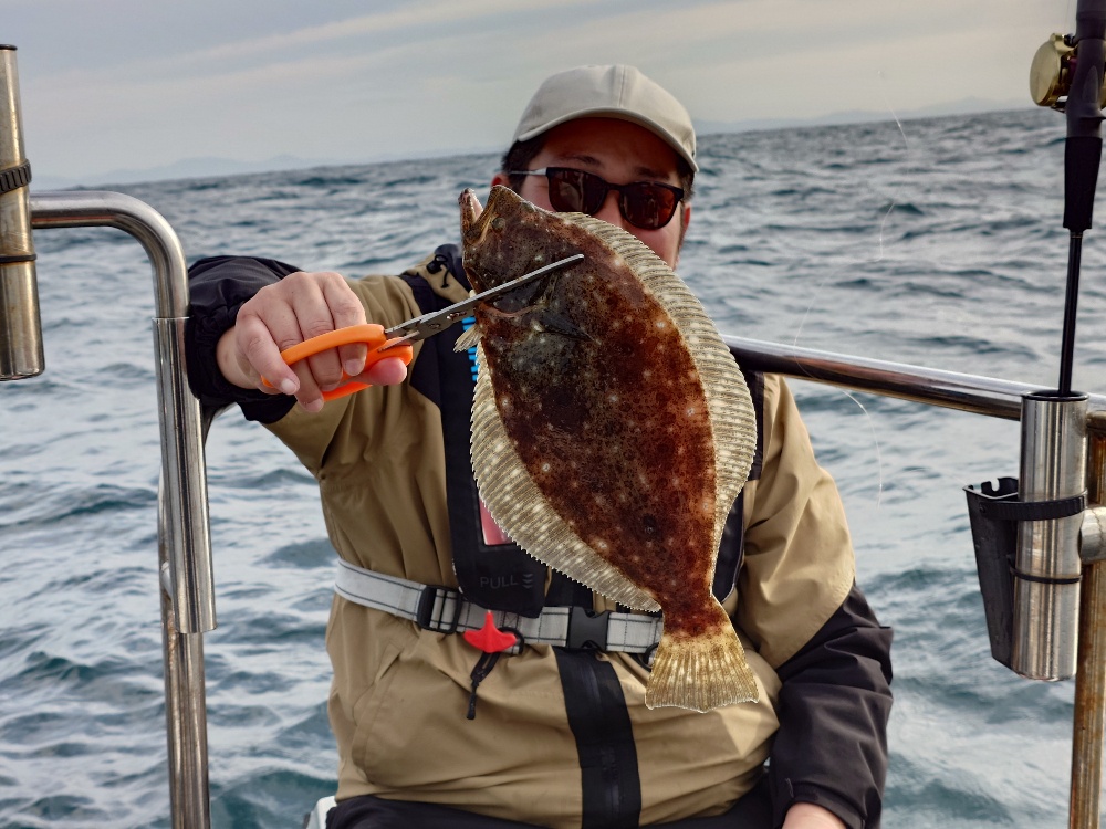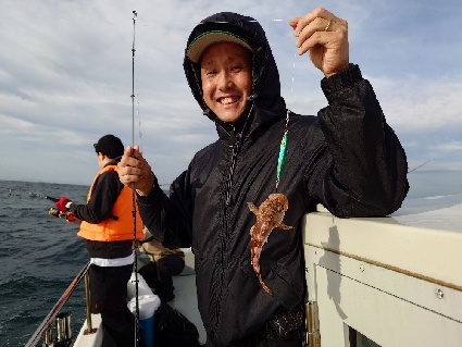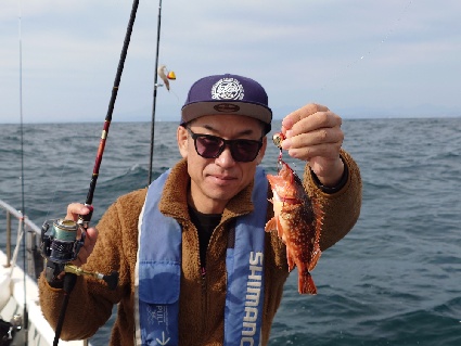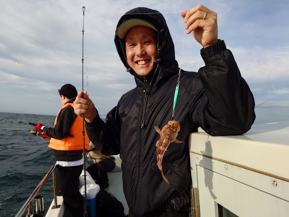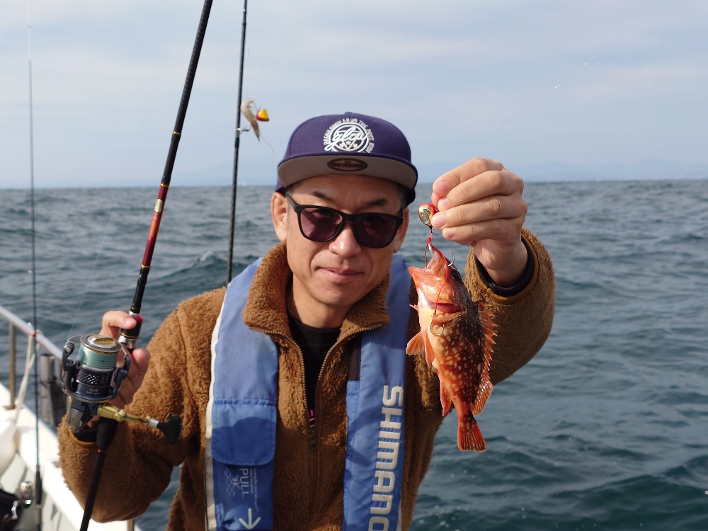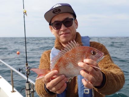 朝のうち南風が吹きウネリもあったのですが、次第に風が弱まり一時波が収まり釣り易い状態になった時に小振りではありましたがテンヤで本命マダイが1枚出ました。他にはヒラメやカサゴ、ショウサイフグ等があがりました。その後11時過ぎに南風が強まり荒れだしたので早上がりとしました。
